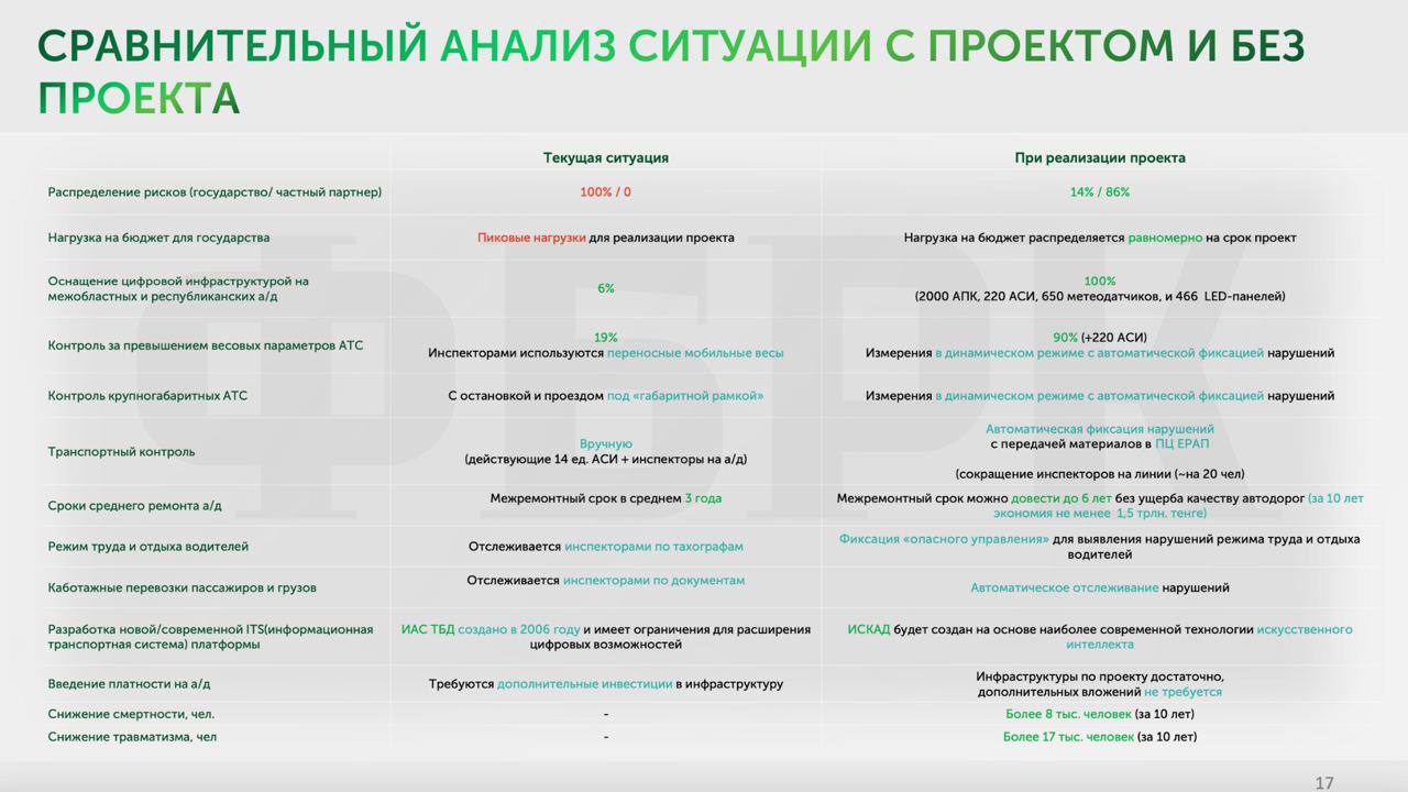 Что касается бюджетной эффективности проекта, разработчики заявляют, что к 2035 году только прямые бюджетные поступления составят более 515 млрд тенге. Сюда входят штрафы за различные нарушения, налоги и сборы за проезд автотранспорта.