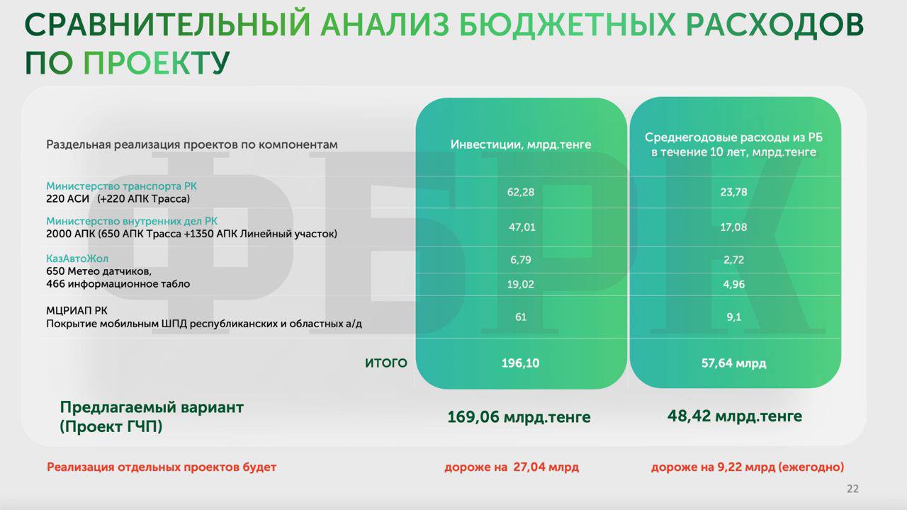 В распоряжении редакции ФБРК оказался проект договора государственно-частного партнёрства (ГЧП) на внедрение интеллектуальной системы контроля на автомобильных дорогах (ИСКАД). Бюджетная эффективность совместного проекта Freedom Telecom и Sergek Group за 10 лет должна составить 2,855 трлн тенге. А пока обо всём по порядку.